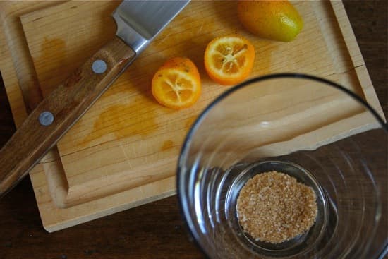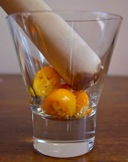 Using a muddler or the handle of a wooden spoon, mash 7 fresh mint leaves, 1 lemon half, quartered lengthwise, and 1 tbsp.