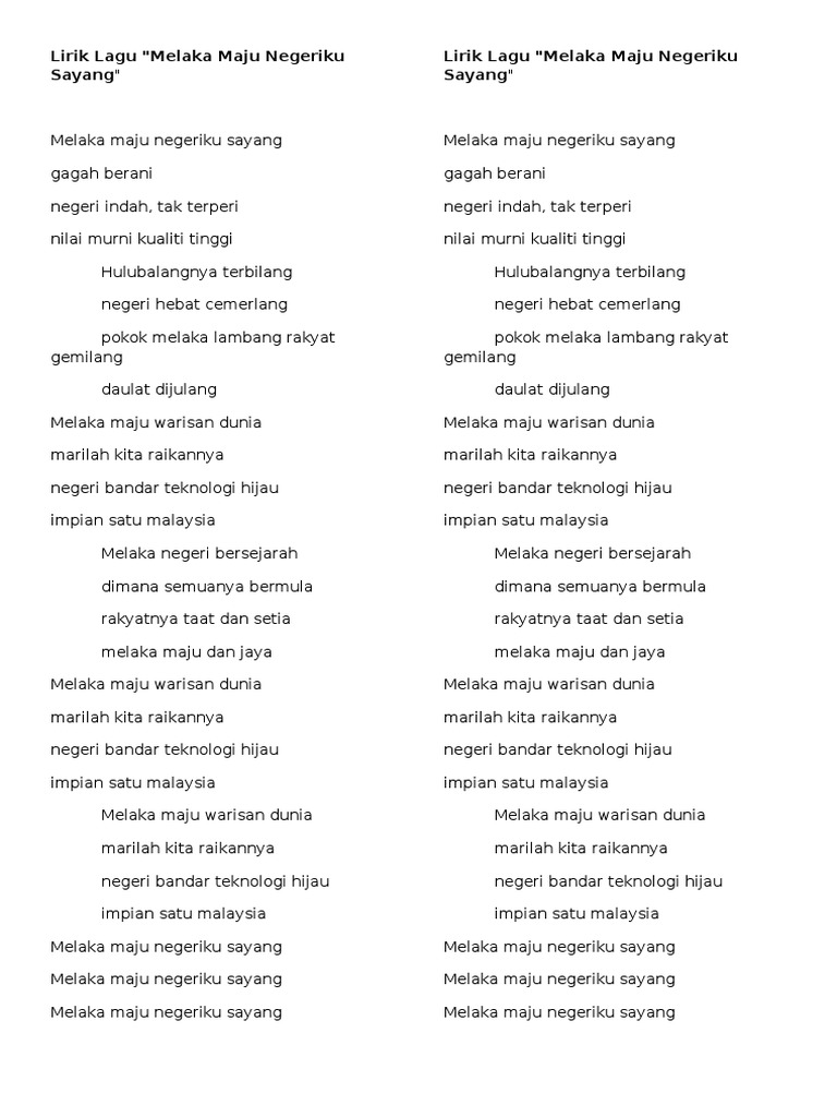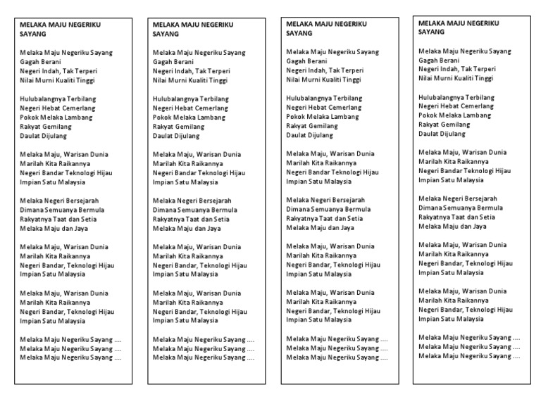 Melaka negeri bersejarah tempat tumpah darah kita dijunjung dengan sepenuh jiwa untuk maju dan jaya rakyat melaka sudah bersatu padu berikrar taat setia jujur berkhidmat setiap masa melaka maju jaya. It was written and composed by saiful bahri, who also wrote the lyrics to the selangor state anthem, duli yang maha mulia. Malaysia state anthem melaka melaka maju jaya. Lagu negeri melaka melaka maju jaya mp4. Melaka negeri bersejarah tempat tumpah darah kita dijunjung dengan sepenuh jiwa untuk maju dan jaya rakyat melaka sudah bersatu padu berikrar taat setia jujur berkhidmat setiap masa.