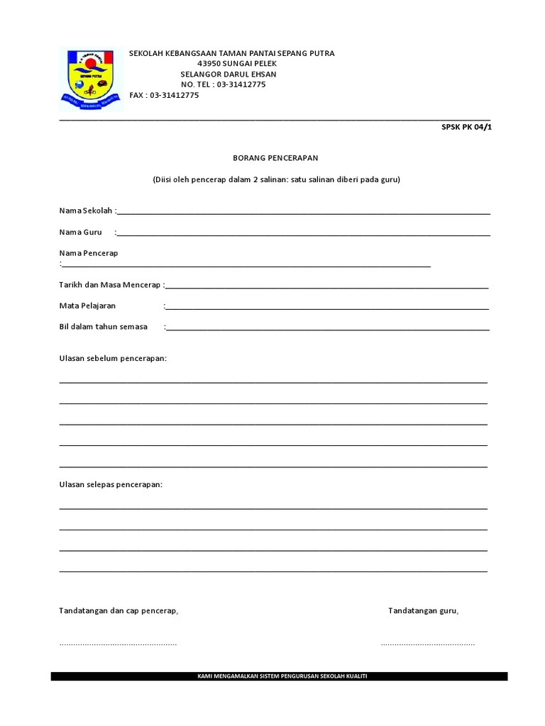 Borang pencerapan standard 4 skpmg2 nama guru opsyen tarikh no. Borang pemantauan guru ganti 2020. Panduan mengisi borang permohonan bantuan persekolahan kpm. Guru hendaklah mengisi dua salinan borang kebenaran keluar dan dapatkan tandatangan penolong kanan (untuk menyediakan guru ganti) dan tandatangan guru besar. Sekolah kebangsaan durian tawar borang pencerapan pengajaran guru (disesuaikan dengan format skpm).